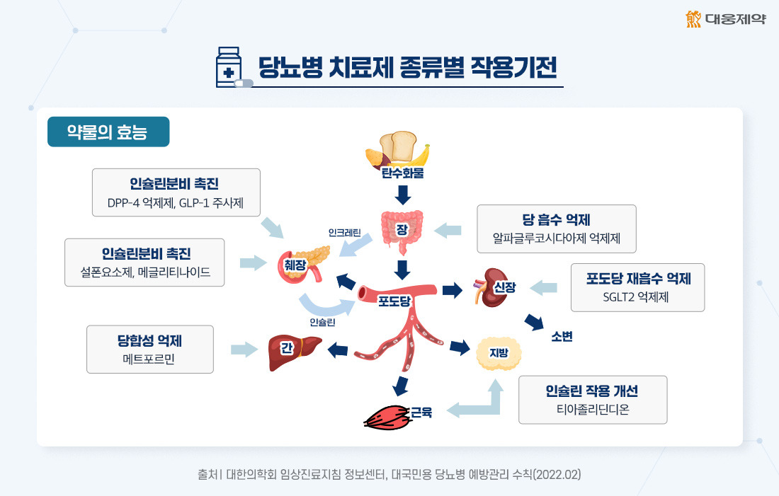 - 비구아나이드계: 간에서 포도당 생성을 억제하고 말초 조직의 인슐린 감수성을 높입니다.
